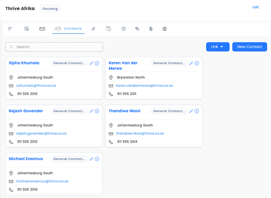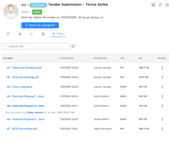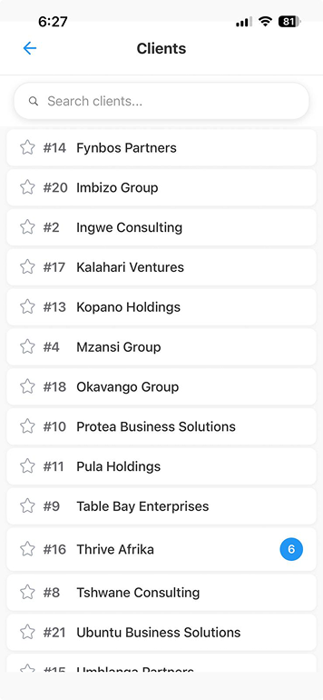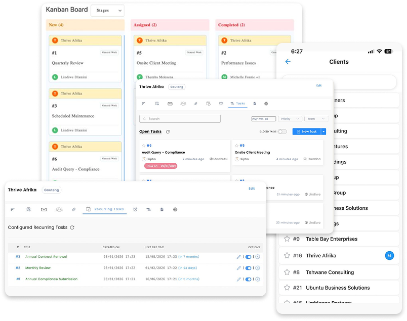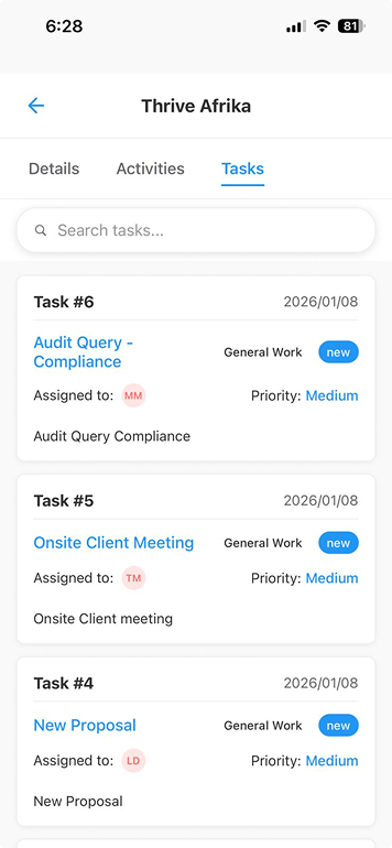 Stop hunting through emails, spreadsheets, and WhatsApp. Every client has a complete profile — contacts, history, documents, tasks, and communications — all in one view.