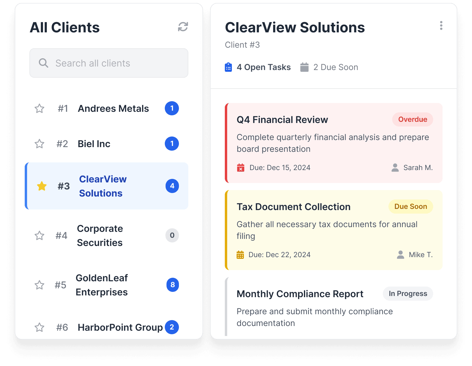 under each client. See all tasks, emails and