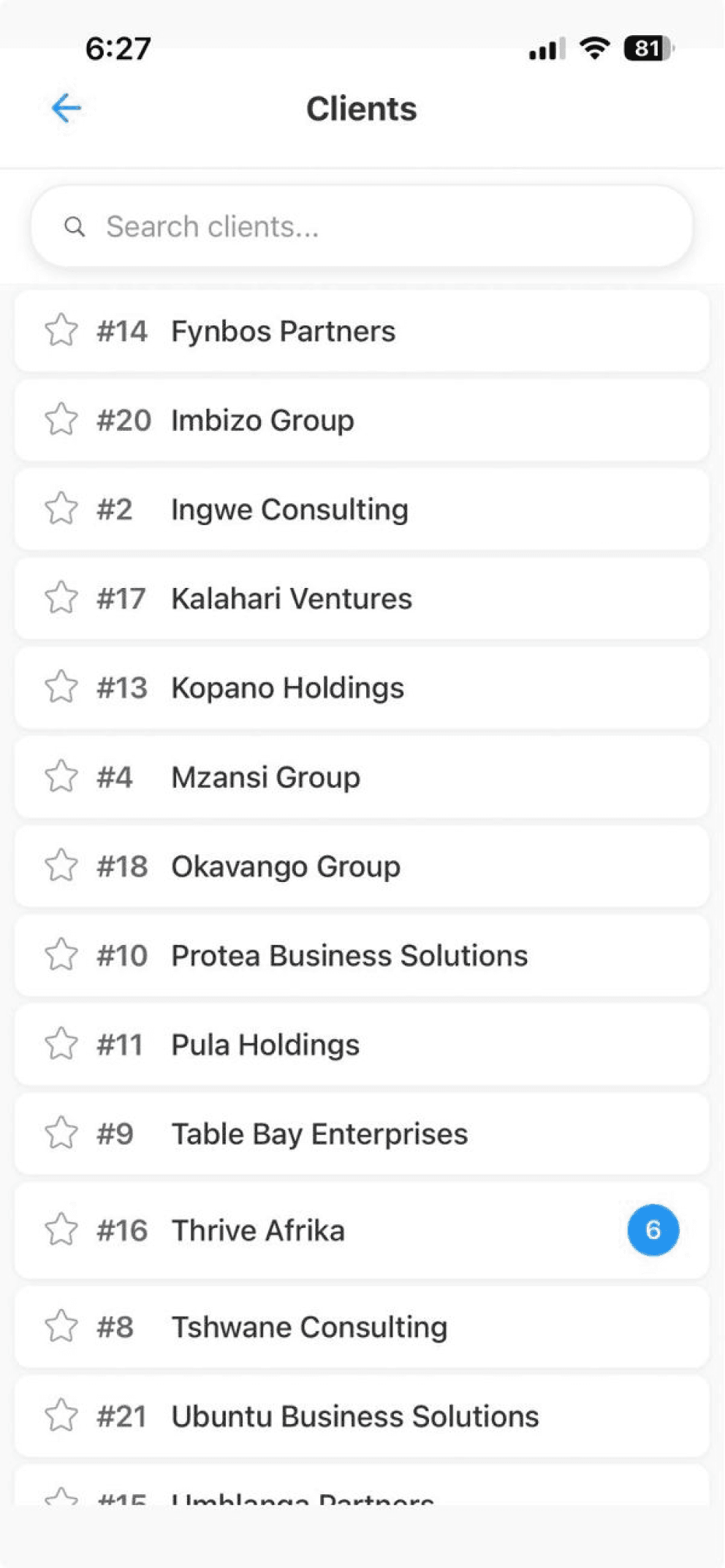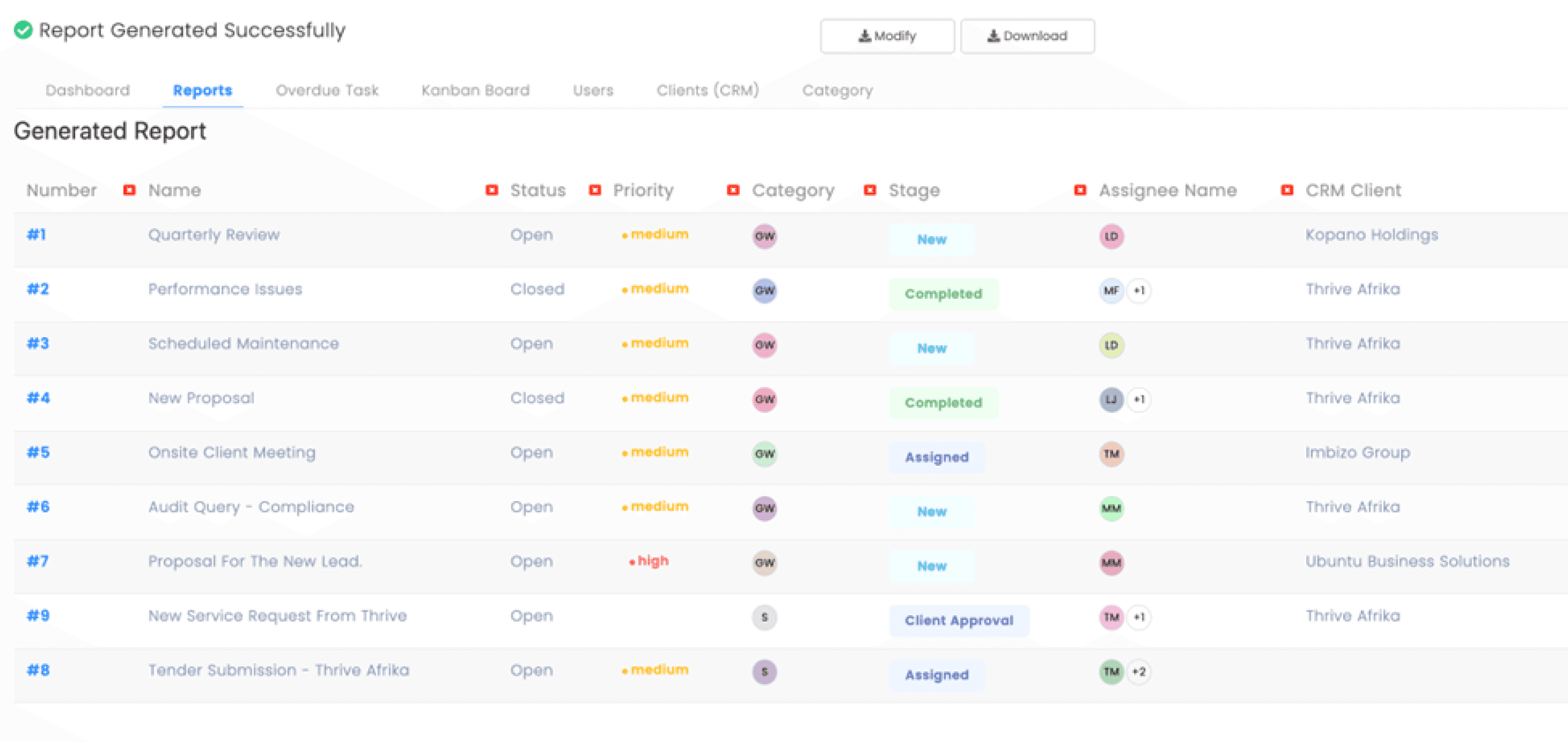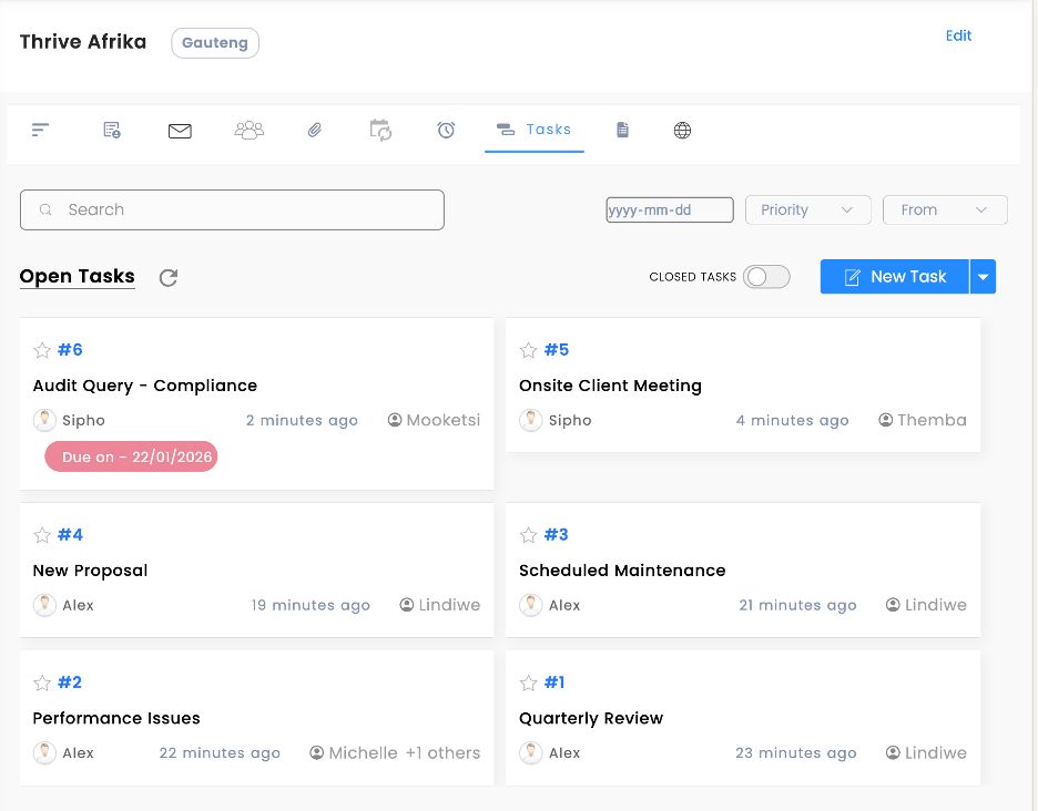 Stop hunting through emails, spreadsheets, and WhatsApp. Every client has a complete profile: contacts, history, documents, tasks, and communications — all in one view.