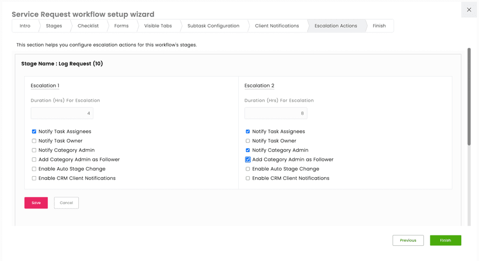 Set time limits for each stage. If work isn't moving, the right people get notified automatically — task owners, managers, or admins. Two escalation levels let you catch issues early before they become client complaints.