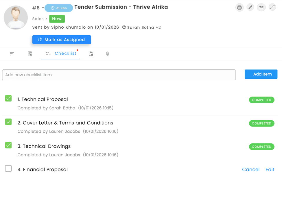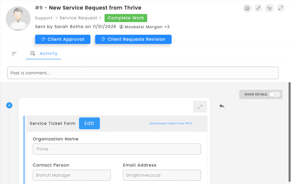 Complete a service request and a billing task is automatically created for finance. No manual handoffs. No “I forgot to tell them.” Work flows between teams without someone chasing it.