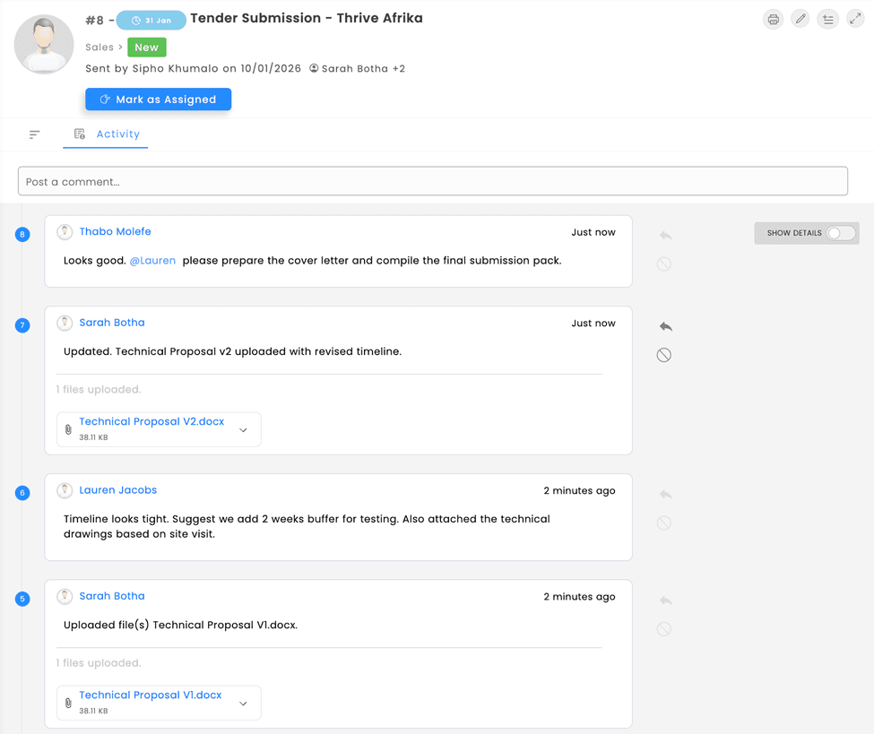 See changes in real-time across functions. Everyone remains in the loop without needing to be copied on every email or added to every WhatsApp group.